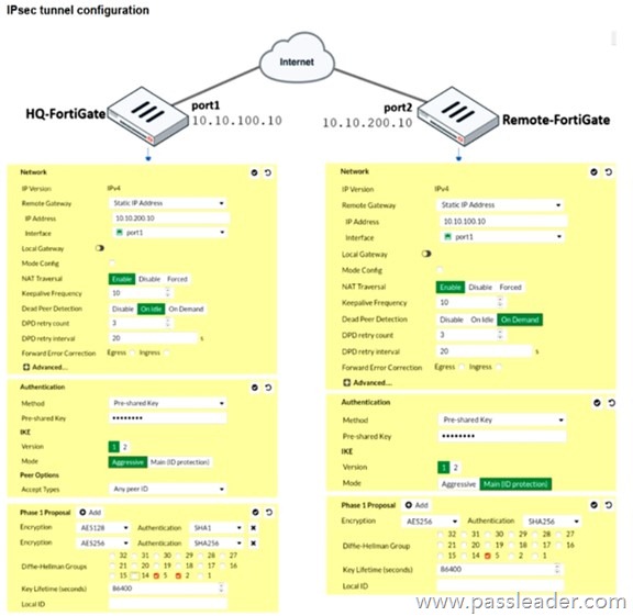 – On the HQ-FortiGate, the IKE phase 1 mode is set to Aggressive, while on the Remote-FortiGate it is set to Main (ID protection). Both sides must use the same IKE mode for phase 1 to come up, so changing HQ-FortiGate to Main mode resolves this mismatch.